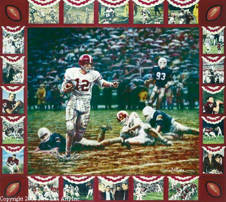 packed with both Alabama and Auburn fans who braved the severe conditions to witness the mud bath. At one point in the game, Ken "the Snake" Stabler managed to slip loose from Auburn defenders and slosh his way 47 yards for a Tide touchdown. The TD and extra point accounted for Bama's only scoring in the game. But, it was enough to beat Auburn, who scored only a field goal and the game ended 7-3. Run in the Mud is the first print in the Legendary Alabama Football Players