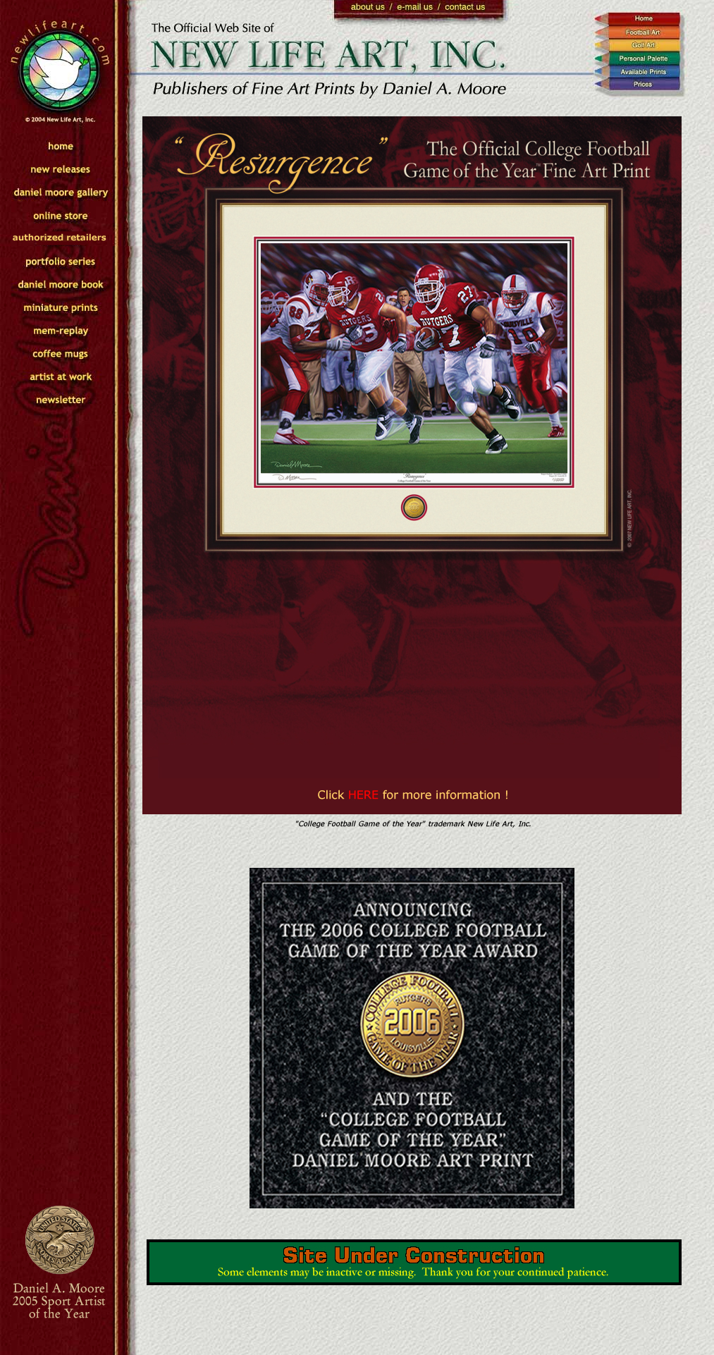 Artist Daniel A. Moore's latest creation, "Resurgence", symbolizes the team effort put forth throughout Rutgers' entire 2006 season. It depicts Brian Leonard clearing the way for Ray Rice's run that set up the winning Field Goal, as Coach Schiano observes the action from the sideline. The painting is being offered in limited editions of Fine Art Prints and Original Canvas Replicas. In recognition of the crucial role that the great school spirit and support played in realizing such a remarkable season, each print will be accompanied by a special gold embossing of the offical College Football Game of the Year™ Award.